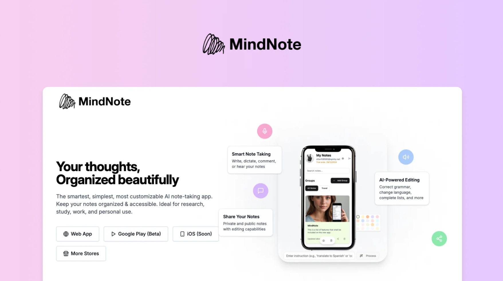 Turn chaos into clarity. MindNote transforms messy notes and scattered thoughts into structured mind maps and polished summaries — in seconds. Let AI organize your ideas, so you can focus on creating them.