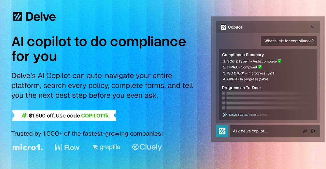 Delve's AI copilot understands your entire tech stack and tells you exactly what to do next. Just ask it "What's my next step? Take me there" and watch Copilot read your screen and start doing tasks for you. Congrats, you've found the light at the end of the tunnel. Join Wisprflow, 11x, Bland, and more in the future of compliance with Delve.
