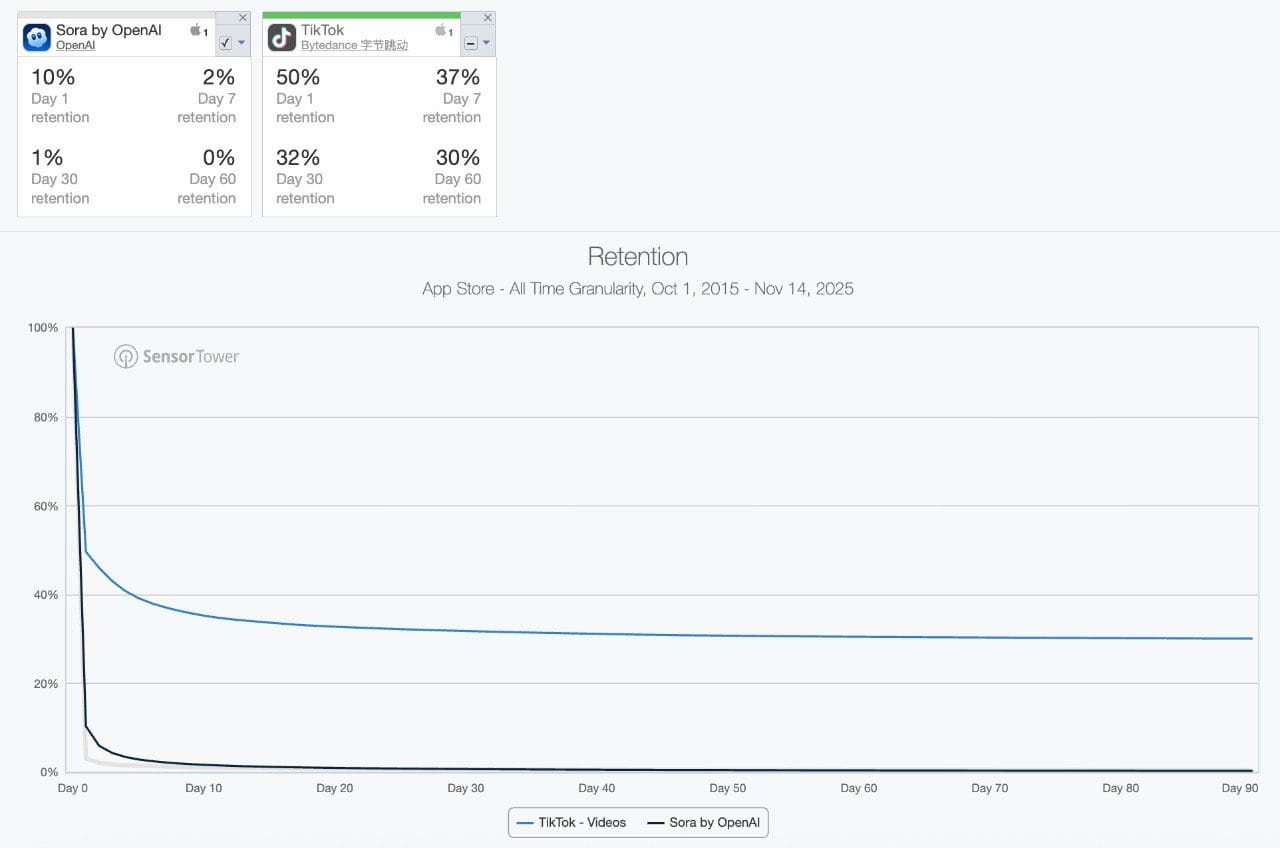 👀 What’s happening: Just months after its hyped debut, OpenAI’s Sora app is already losing users faster than it can render frames. Leaked data shows Sora’s first-day retention at only 10 percent and its 30-day retention collapsing to 1 percent, while TikTok stands strong at 50 and 32 percent. What was once hailed as “the AI era’s TikTok” now looks more like a costly sandbox that most users abandon after the first try.