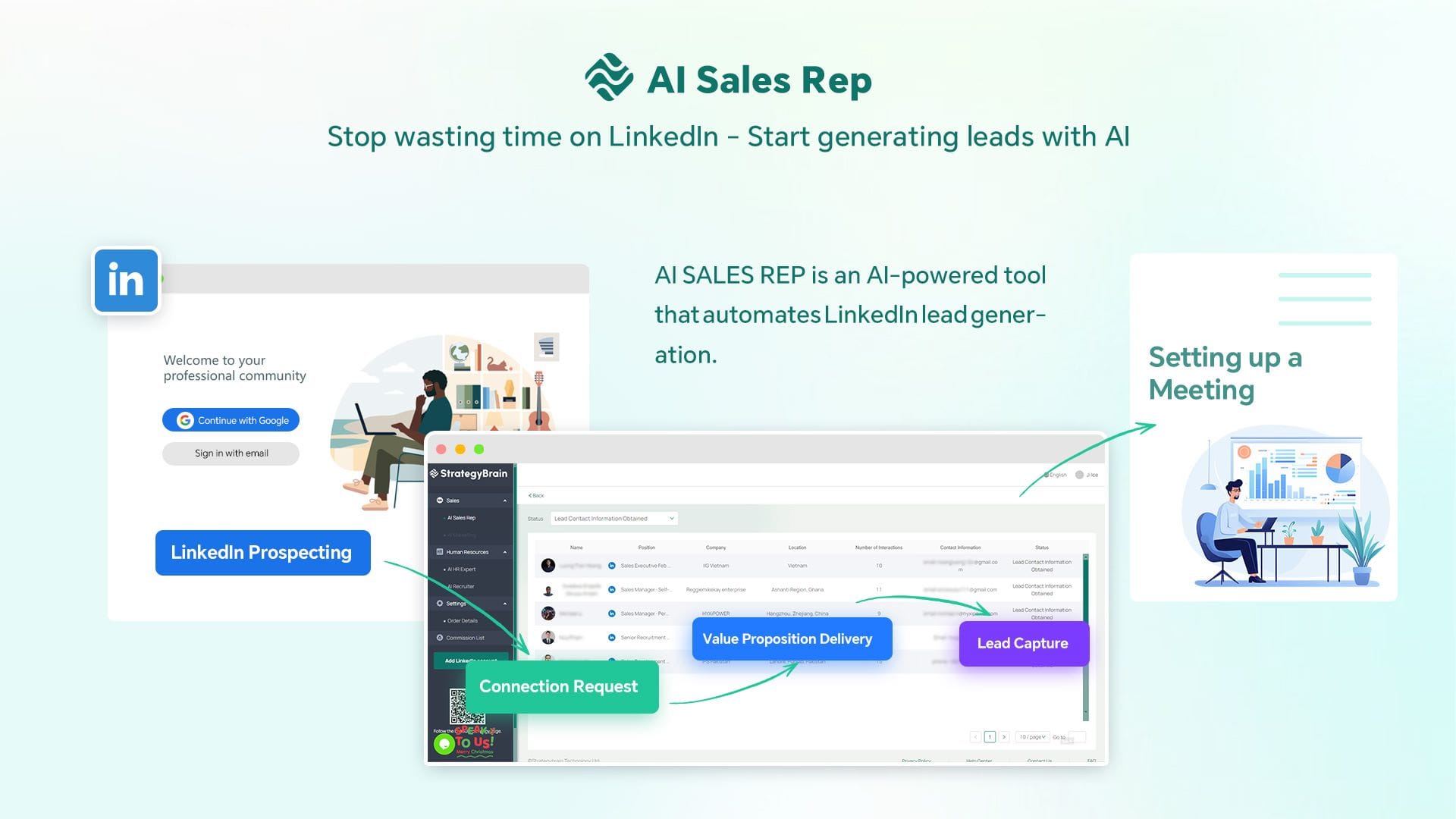 AI Sales Rep never sleeps. It finds, connects, engages, and qualifies leads on autopilot — then guides high-intent prospects straight to a demo call.